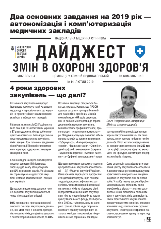 Дайджест змін в охороні здоров’я 14 Дата публікації: 19 Лютого 2019 року. Опубліковано в Реформа МОЗ. « Назад Вперед »