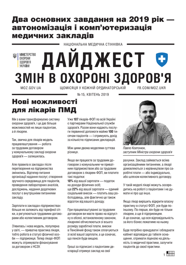 Дайджест змін в охороні здоров’я 15 Дата публікації: 10 Травня 2019 року. Опубліковано в Реформа МОЗ. « Назад Вперед »