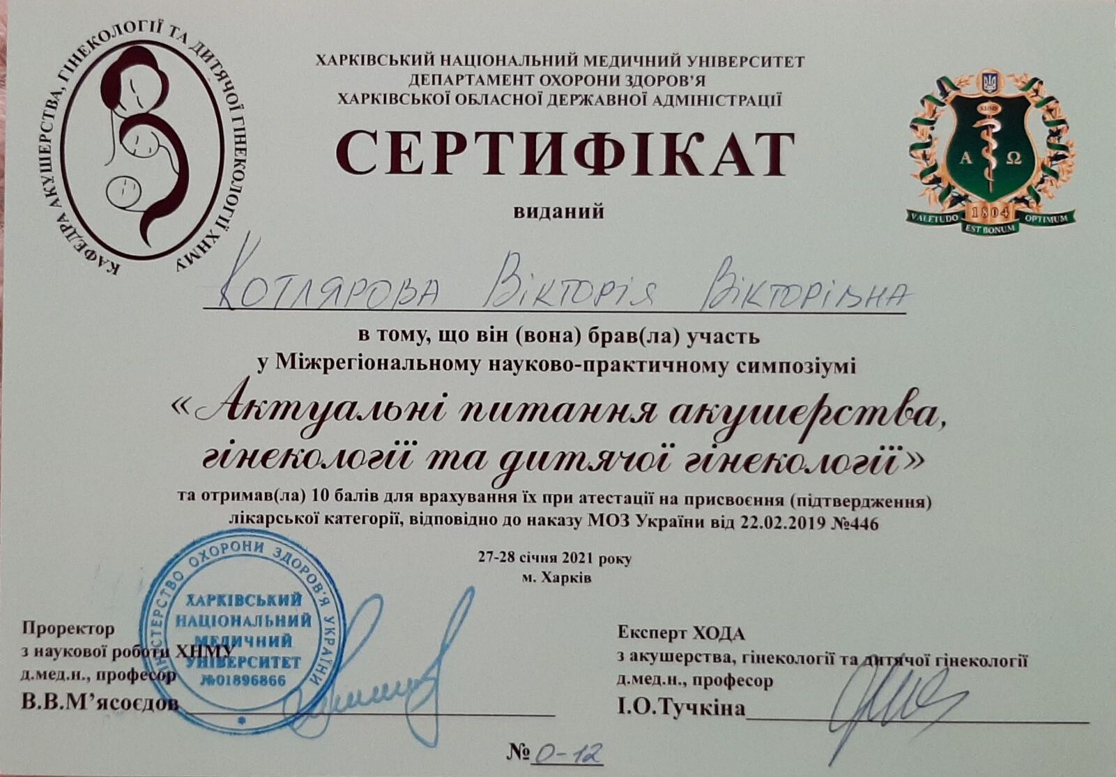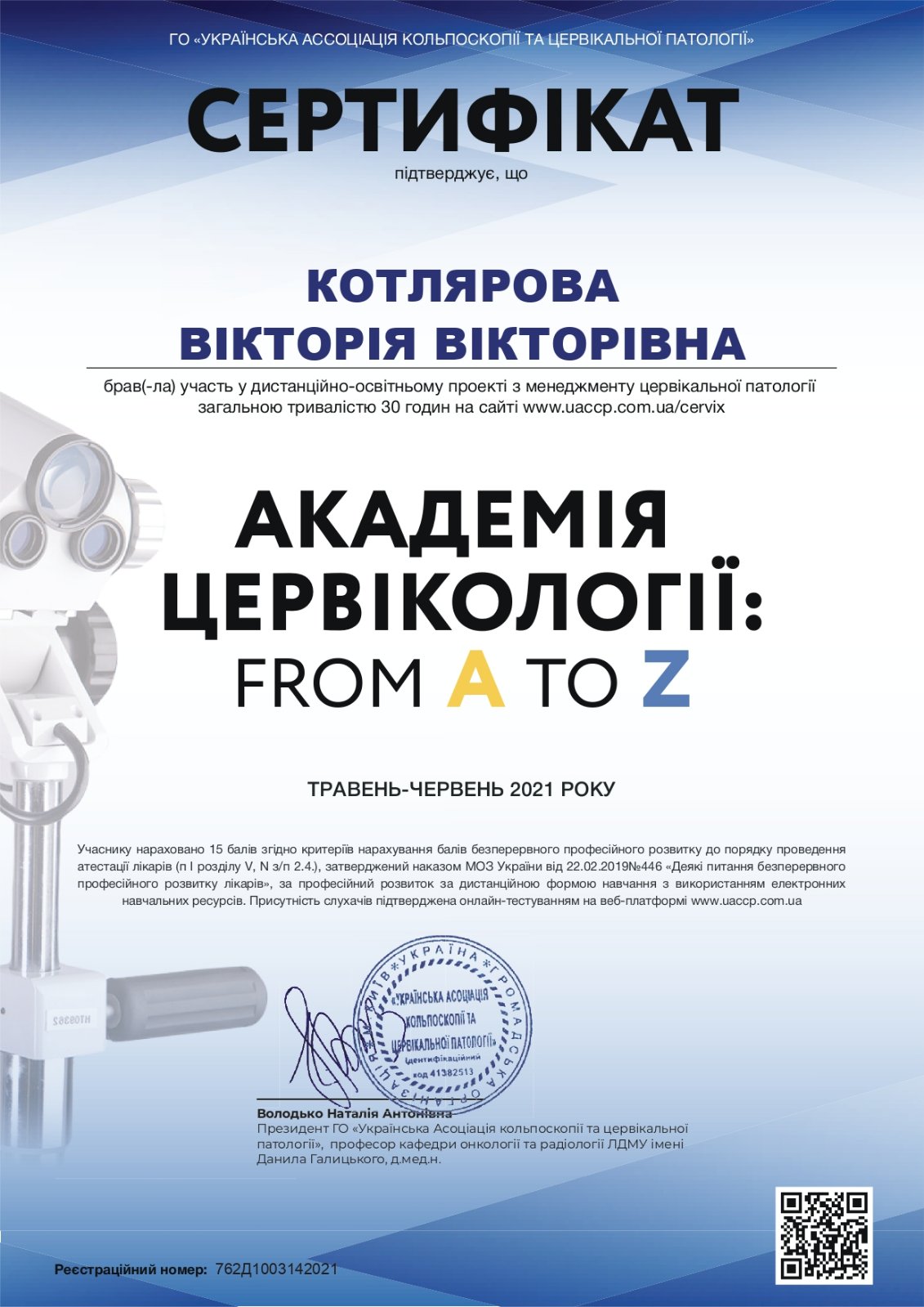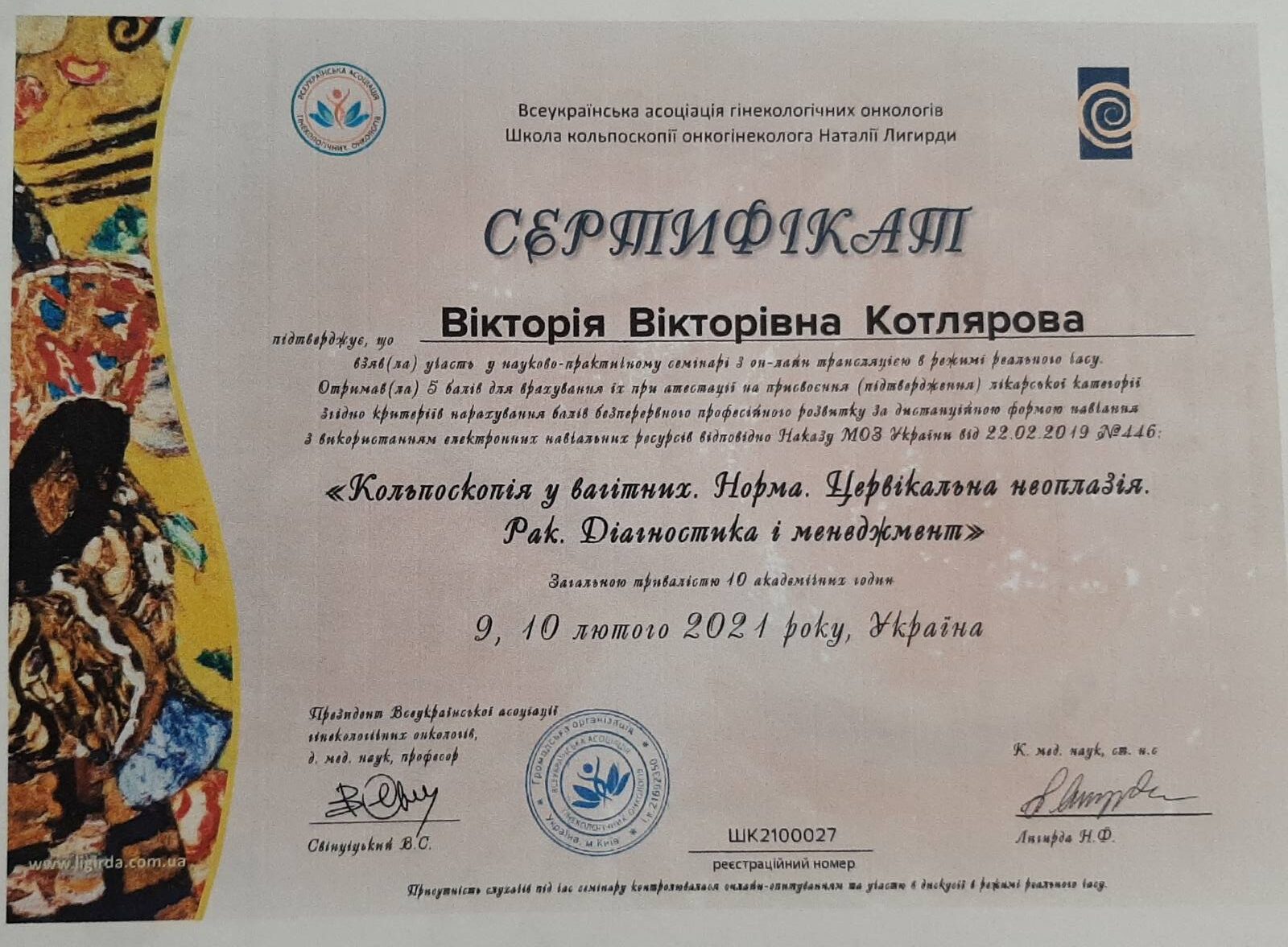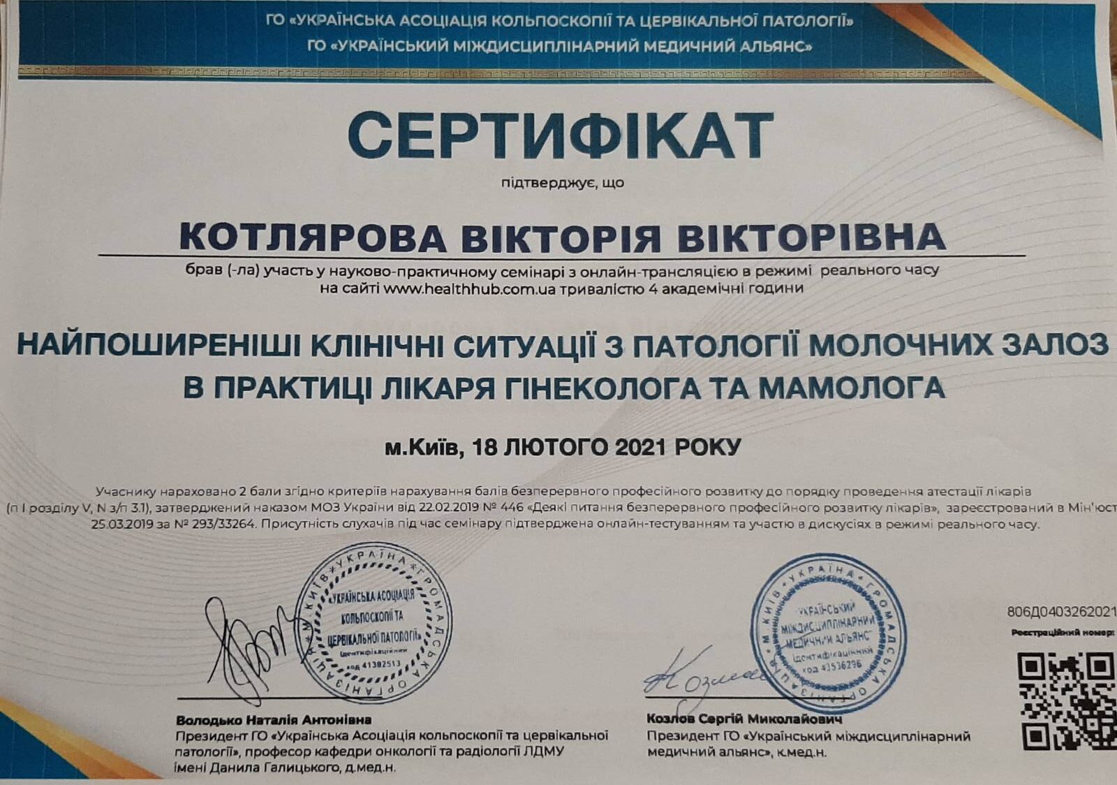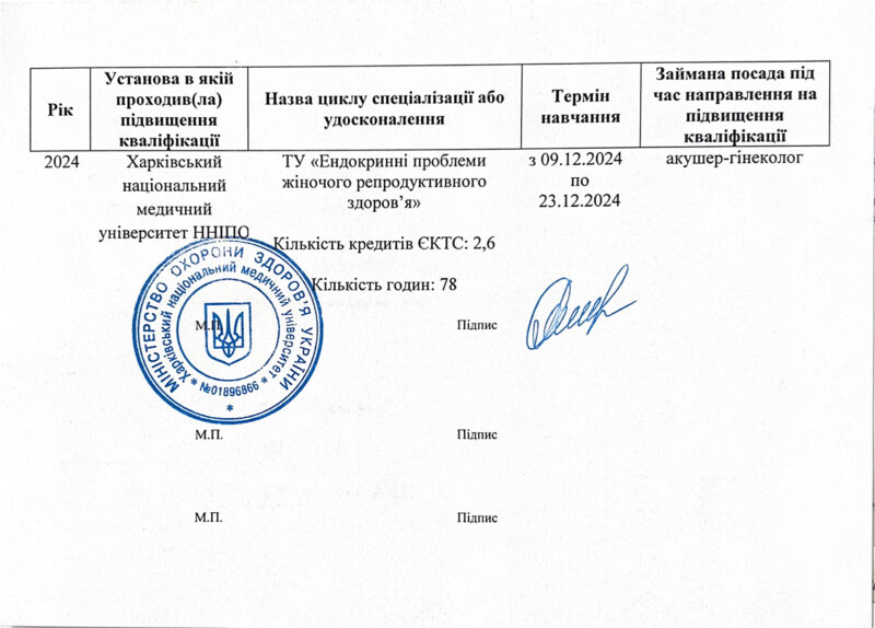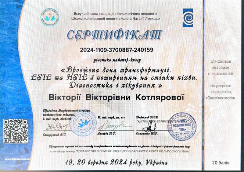 2012 року – Харківська медична академія післядипломної освіти, тематичне удосконалення «Кольпоскопія в діагностиці передпухлинних і пухлинних захворювань шийки матки, вульви і в і піхви»