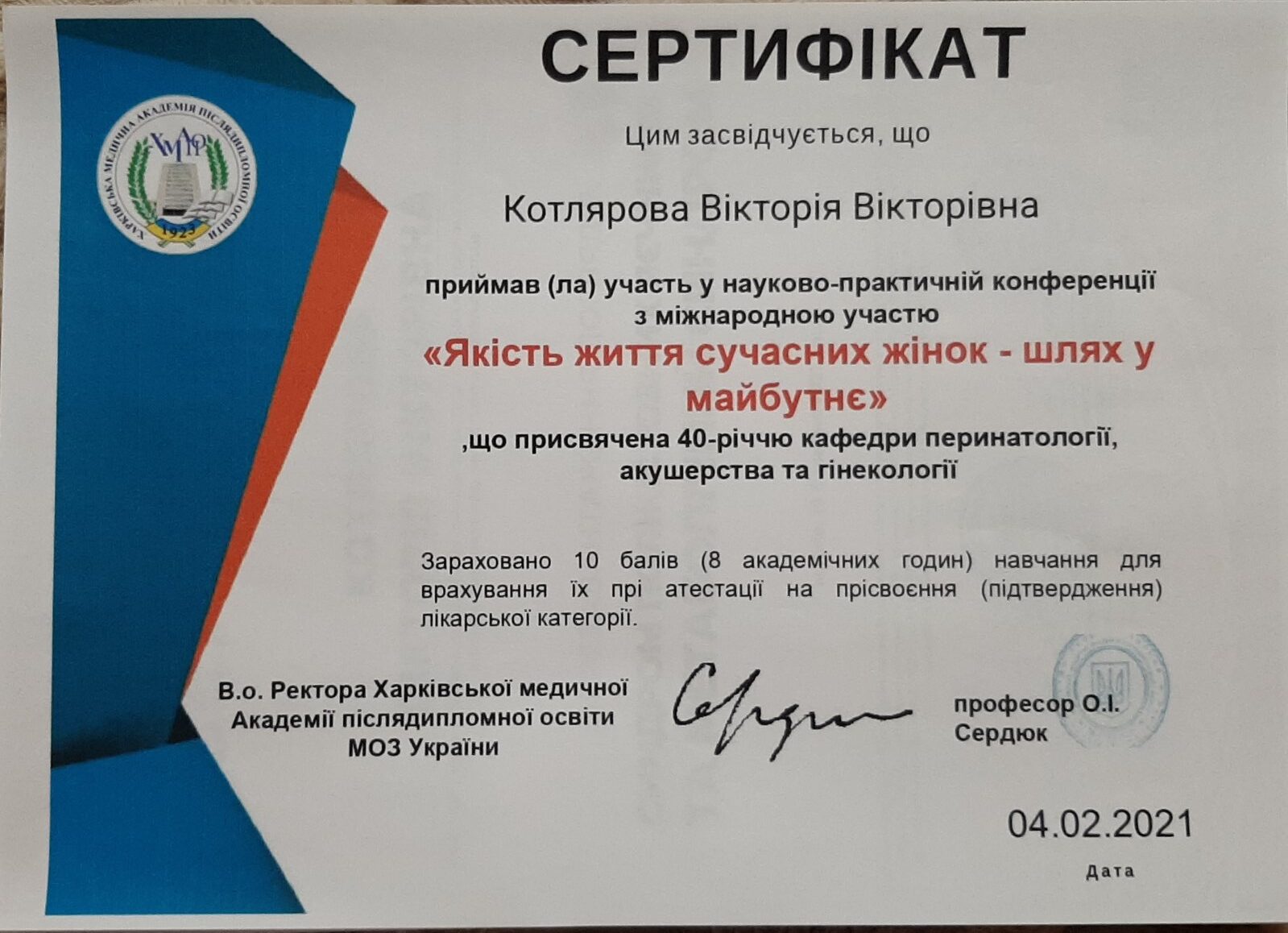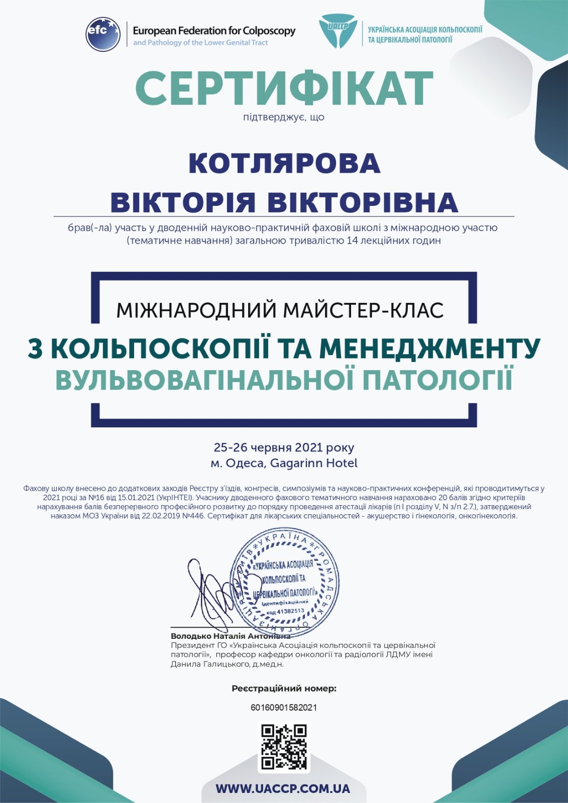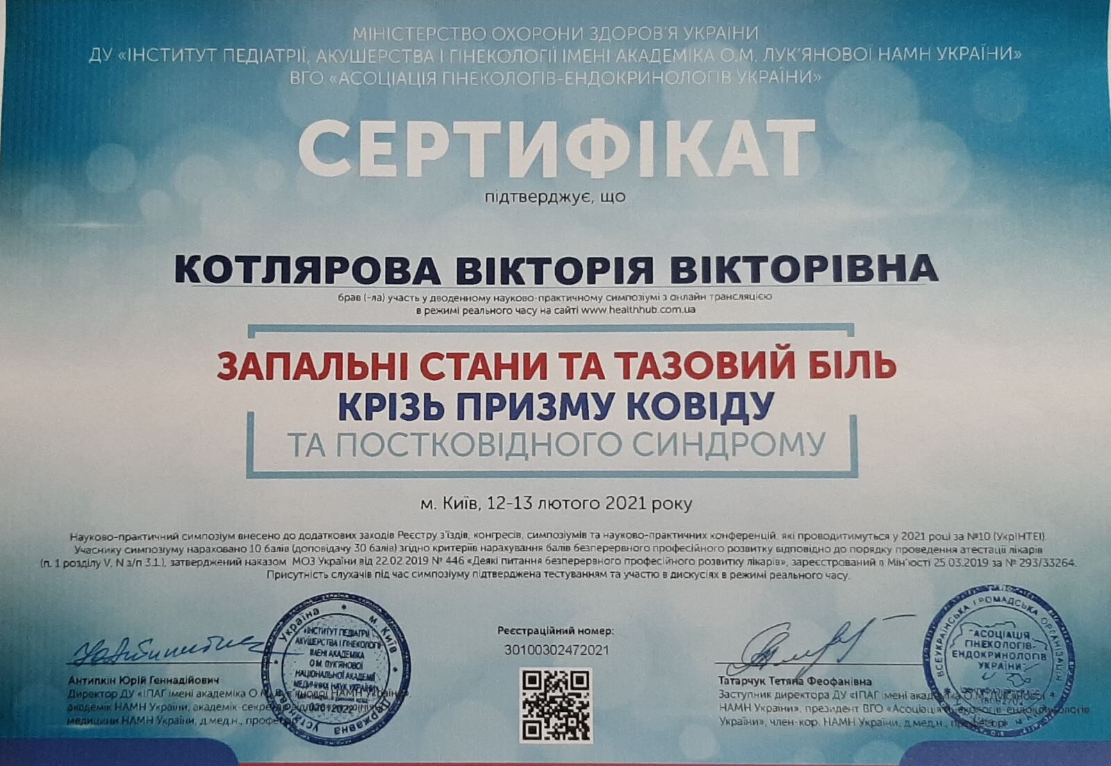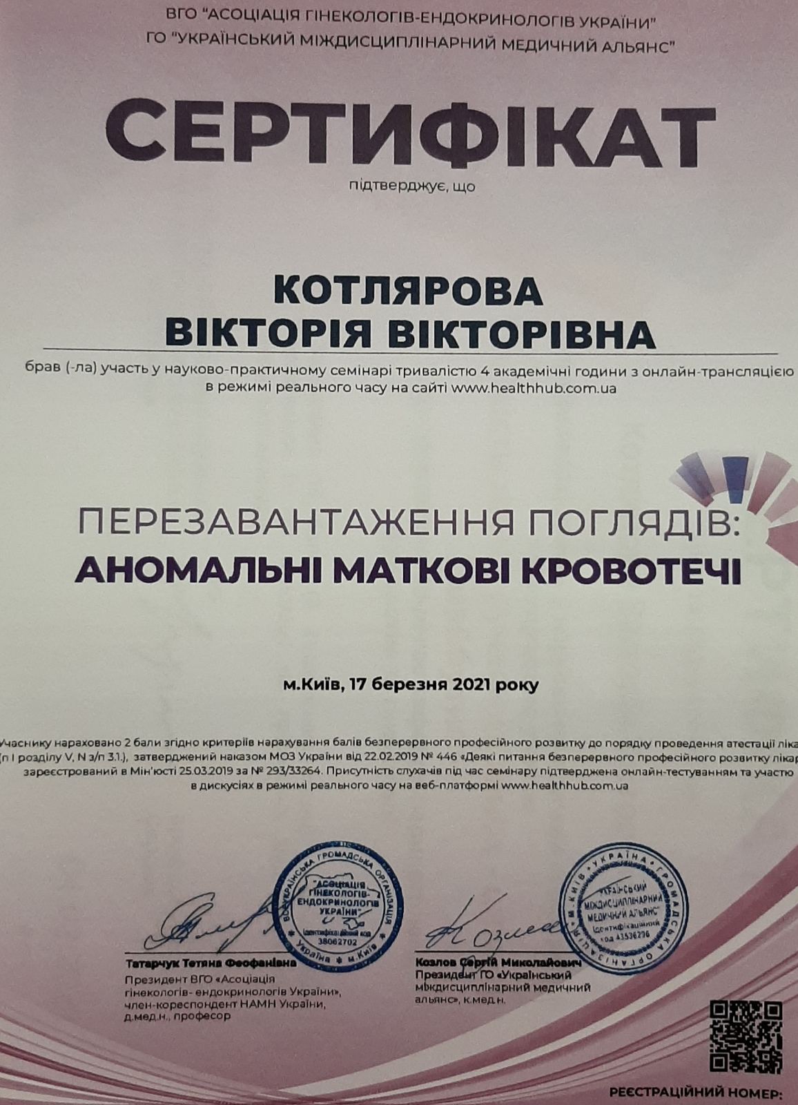 2012 року – Харківська медична академія післядипломної освіти, тематичне удосконалення «Кольпоскопія в діагностиці передпухлинних і пухлинних захворювань шийки матки, вульви і в і піхви»