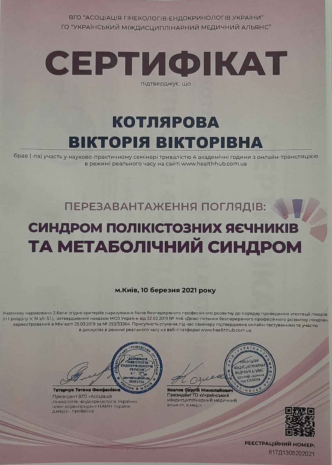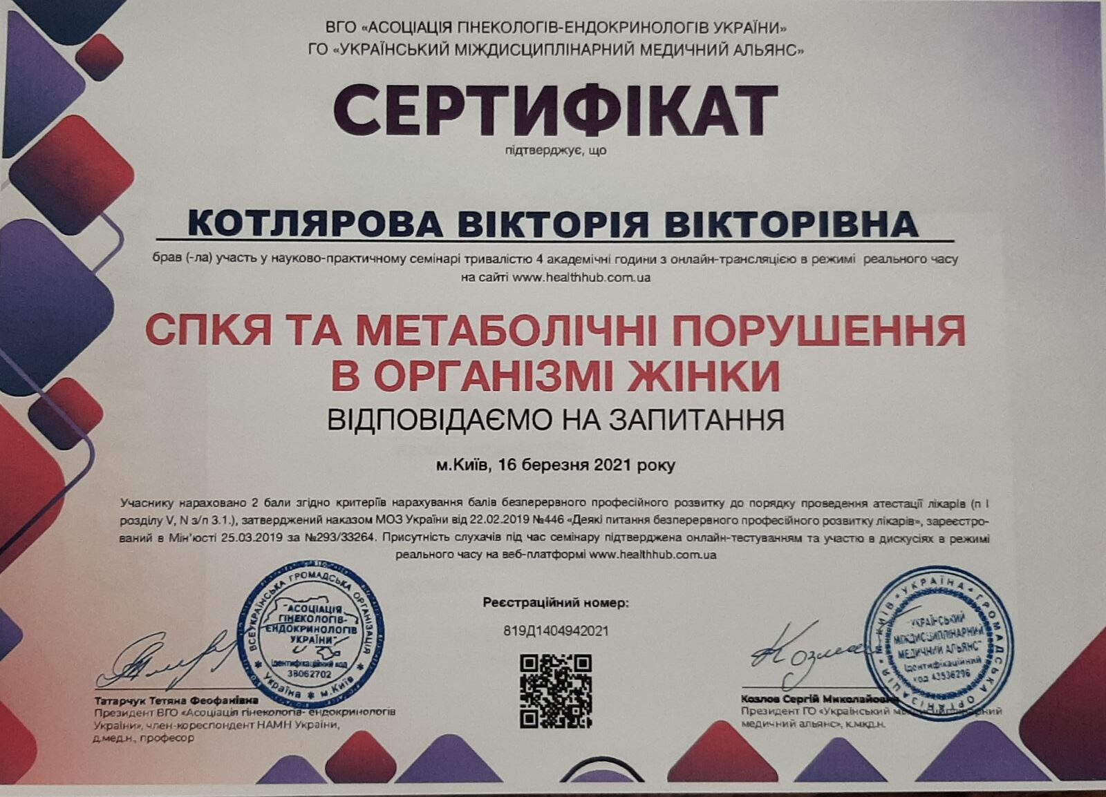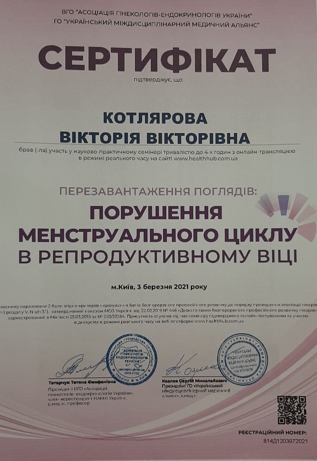 2015 р. – навчання на семінарі «Актуальні питання в ендокринної гінекології» (м.Київ);
