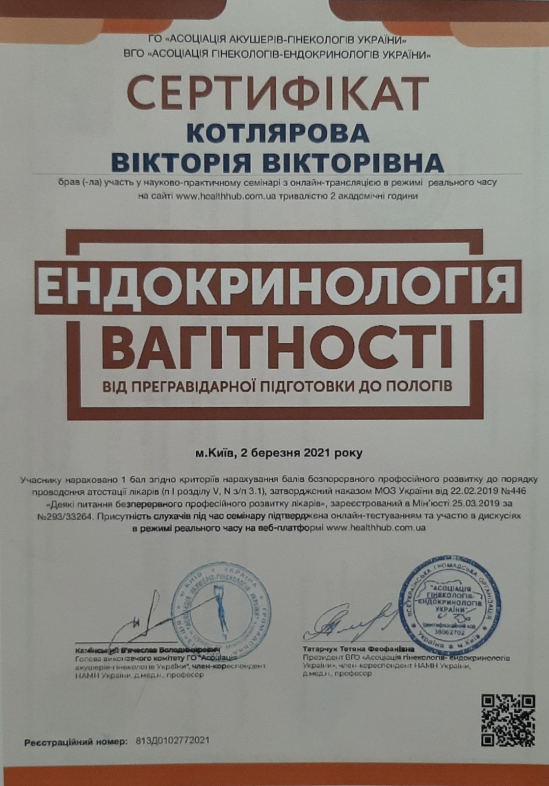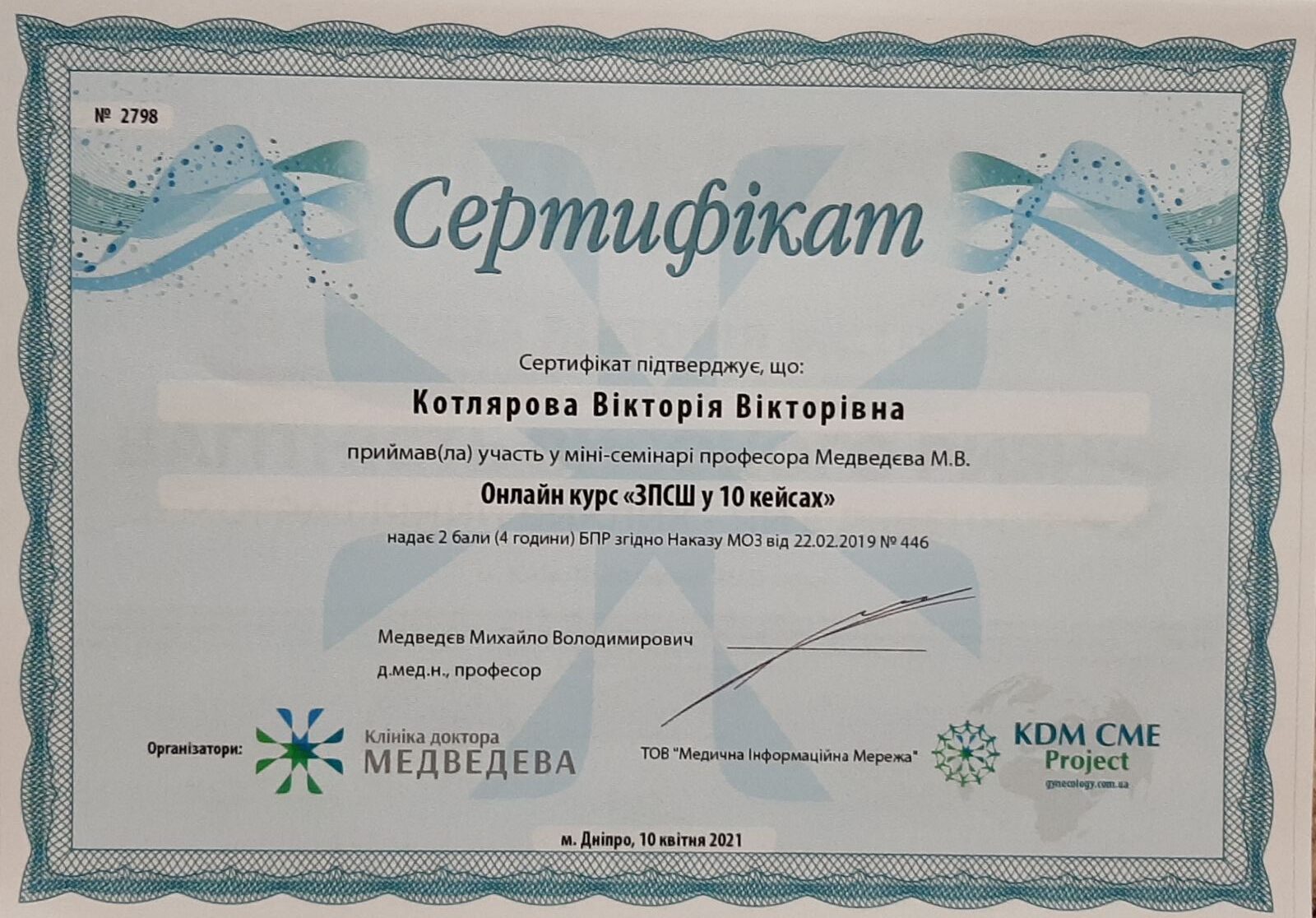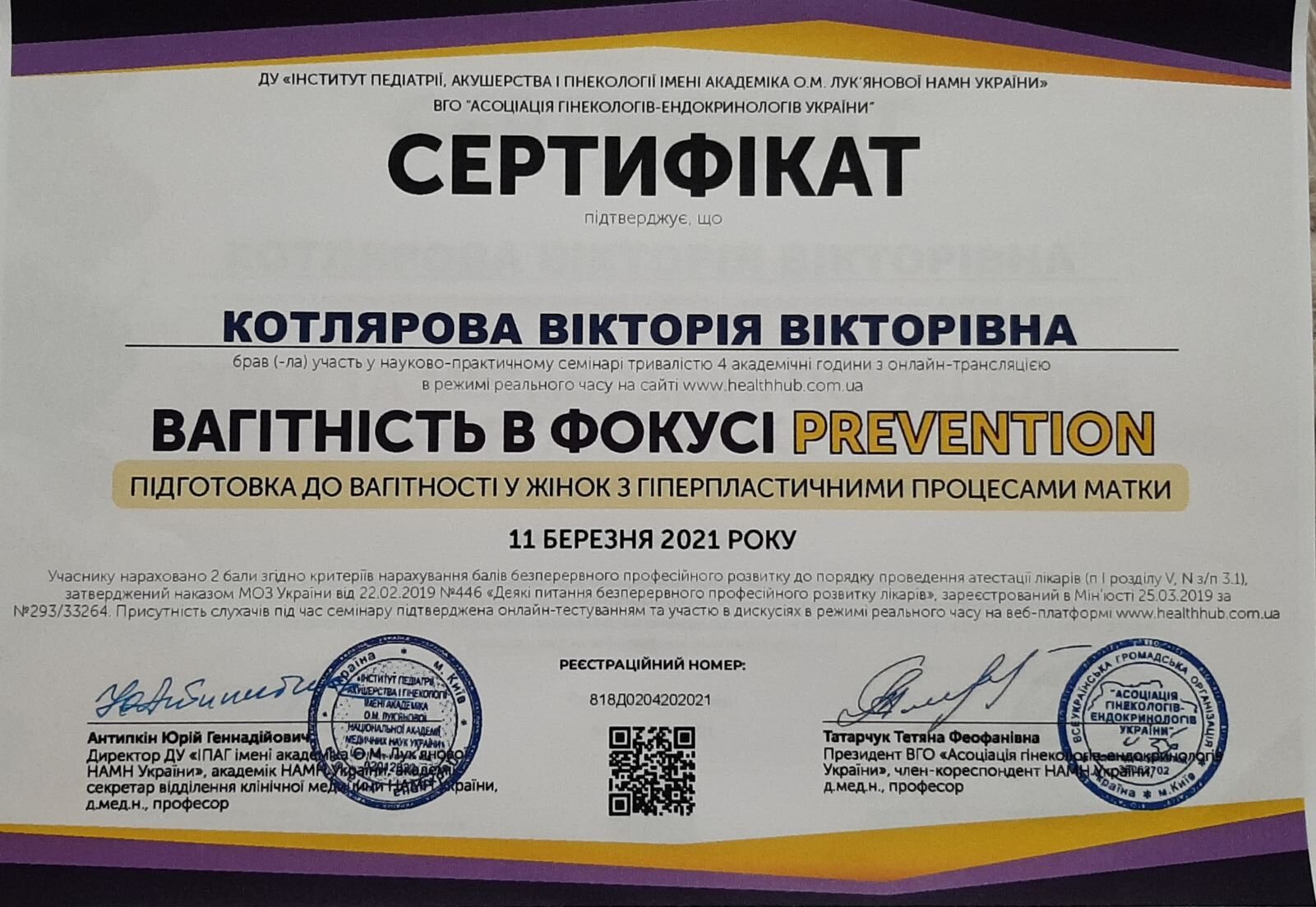 В 2021 р. пройшла цикл тематичного удоконалення “Скринінгові дослідження в перинатальній медицині”.