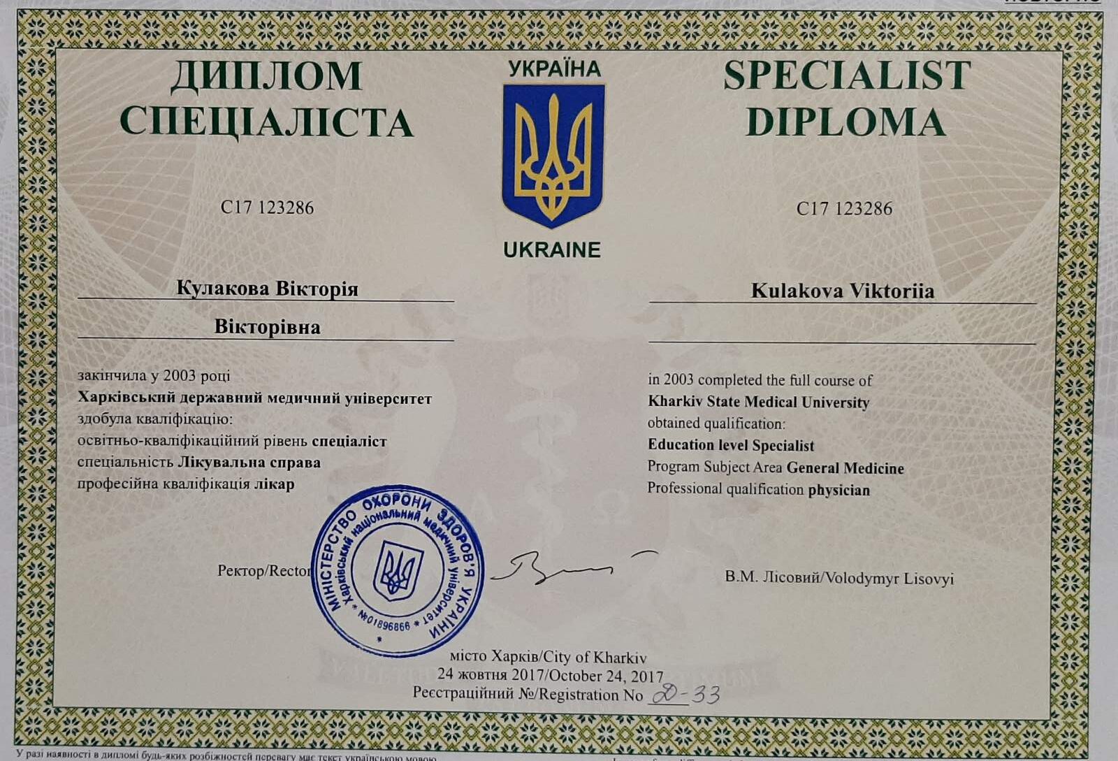 – 1997-2003 рр. – Харківський державний медичний університет, спеціальність «Лікувальна справа».