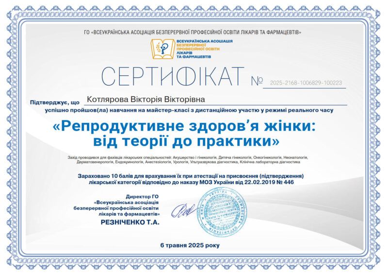 2012 року – Харківська медична академія післядипломної освіти, тематичне удосконалення «Кольпоскопія в діагностиці передпухлинних і пухлинних захворювань шийки матки, вульви і в і піхви»