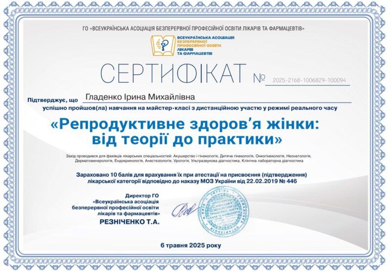 2011 року – Харківська медична академія післядипломної освіти, тематичне удосконалення «Акушерсько-гінекологічна допомога в жіночій консультації».